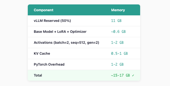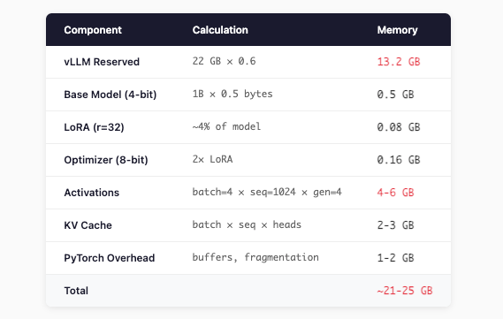 GRPO uses vLLM for fast generation. Here’s the thing most people miss: vLLM reserves a fixed chunk of your GPU upfront.