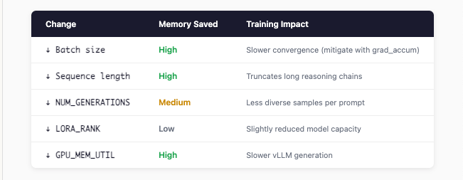 But here’s the kicker: GRPO generates NUM_GENERATIONS completions per prompt. With NUM_GENERATIONS=4, you’re multiplying that memory usage.