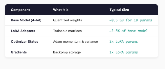 For a 1B parameter model with LoRA, this is usually under 1 GB total. Not our problem.